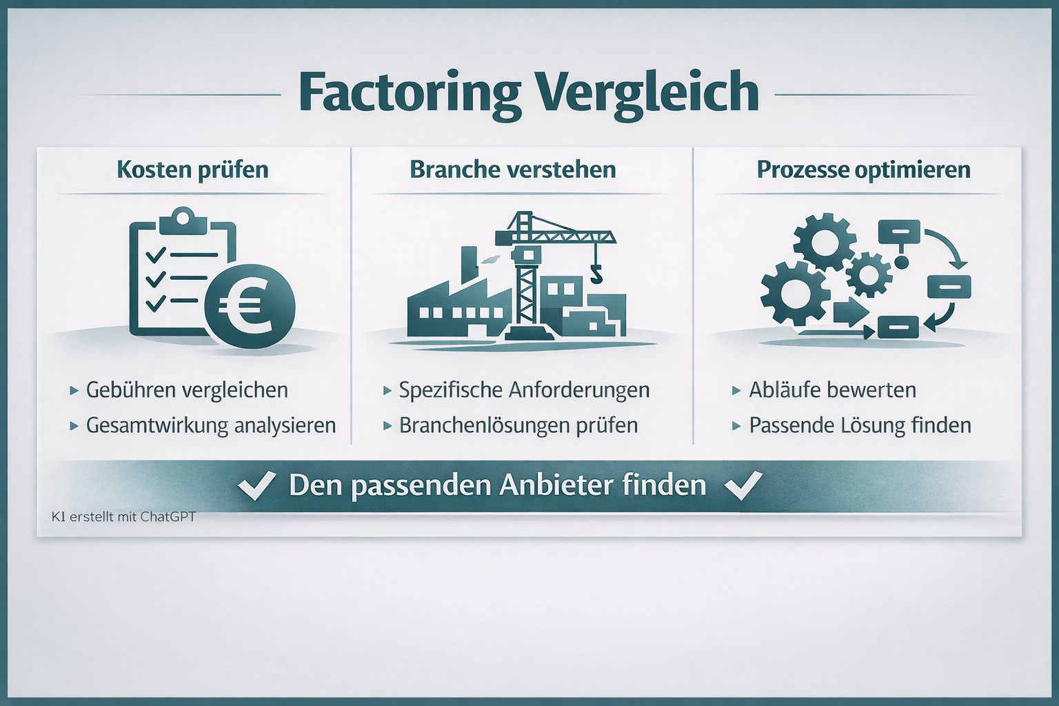 Ein Factoring Vergleich ist dann besonders wertvoll, wenn er nicht nur Preise gegenüberstellt, sondern die tatsächlichen Anforderungen eines Unternehmens in den Mittelpunkt stellt. Wer Anbieter, Kosten, Prozesse und Branchenpassung gemeinsam betrachtet, schafft die Grundlage für eine stabile und langfristig tragfähige Finanzierungslösung.