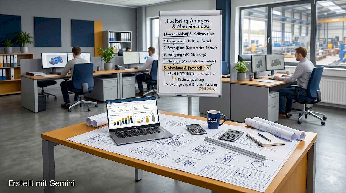 Phase 1 – Konstruktion & Beschaffung: Anzahlungsrechnung nach Auftragserteilung. Spezialisierte Anbieter kaufen auch Anzahlungsforderungen für nicht anderweitig verwertbare Sonderbauteile an. Phase 2 – Fertigung & Montage: Abschlagsrechnungen nach Meilensteinprotokoll – Factor zahlt 90 % innerhalb von 48 Stunden. Freigabeverzögerungen des Auftraggebers werden irrelevant. Phase 3 – Inbetriebnahme & Abnahme: Schlussrechnung nach Funktionsabnahme – 10 % Gewährleistungseinbehalt, ablösbar durch Bürgschaft.