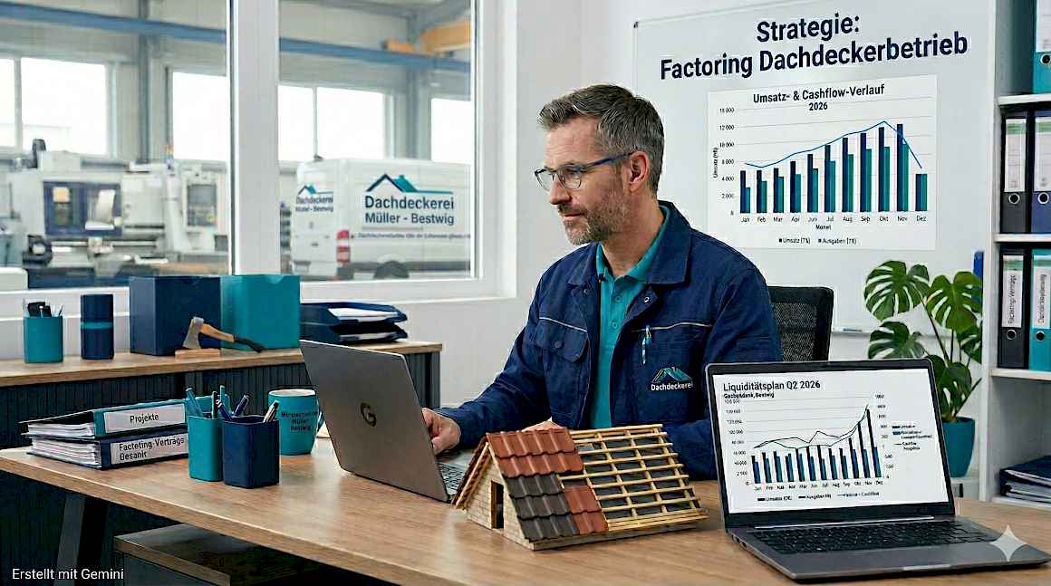 Wer Dacheindeckungen, Abdichtungen und Klempnerarbeiten auf VOB-Basis abrechnet, kennt das Problem: Material und Lohn sind bezahlt, der Auftraggeber zahlt in 30 Tagen oder noch später. Factoring beendet dieses Strukturproblem – dauerhaft und bankunabhängig.