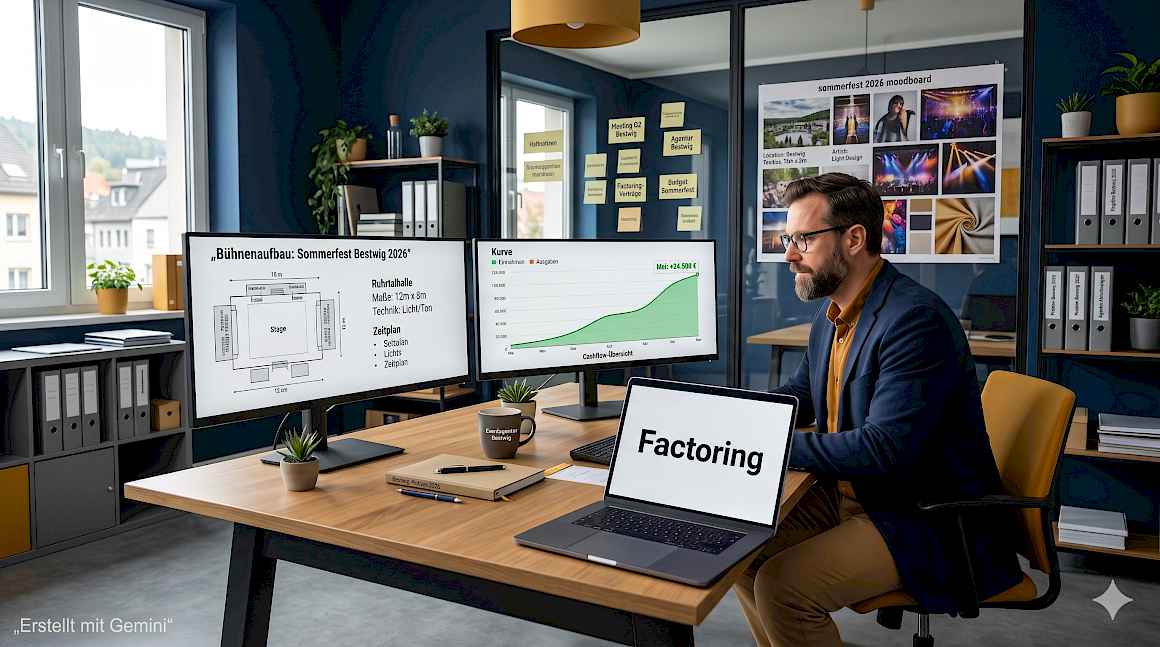 Der unmittelbare Effekt: 100 % des Rechnungsbetrags stehen innerhalb von 48 Stunden zur Verfügung. Das erlaubt die sofortige Beauftragung von Subunternehmern für Folgeprojekte, pünktliche Technikergehälter und die Annahme neuer Aufträge ohne Blick auf den Kontostand. Besonders in der Hochsaison, wenn mehrere Großveranstaltungen parallel laufen, ist das entscheidend.