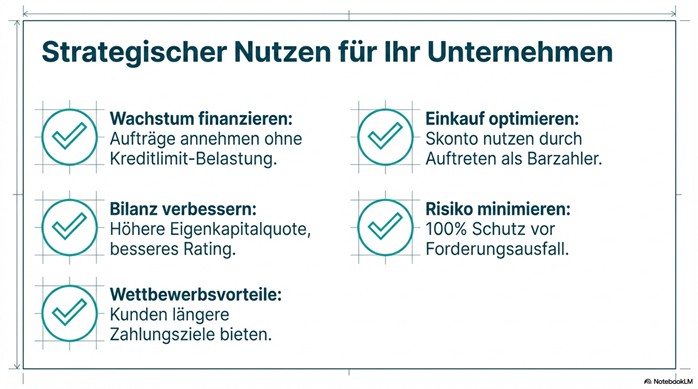 All-In-Gebühr auf vollen Jahresumsatz (inkl. Zins und Factoringgebühr, kein separater Zinsausweis). Dienstvertragsbasis, 100 % Sofortauszahlung. Stilles Verfahren. Kein verbindliches Angebot.