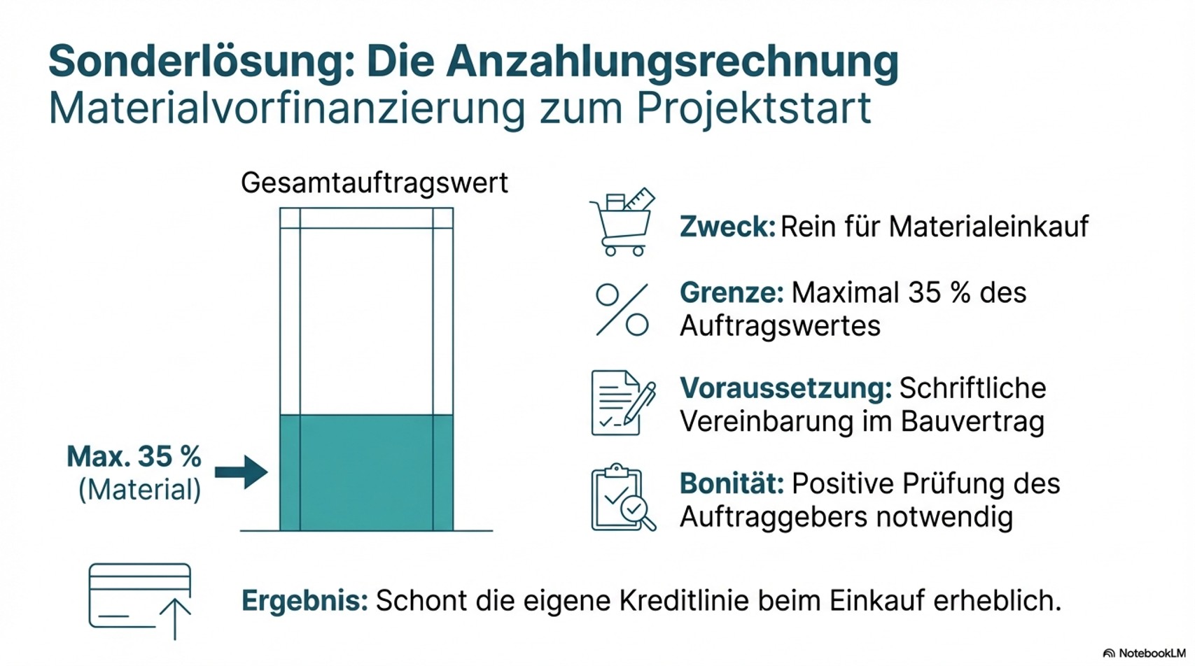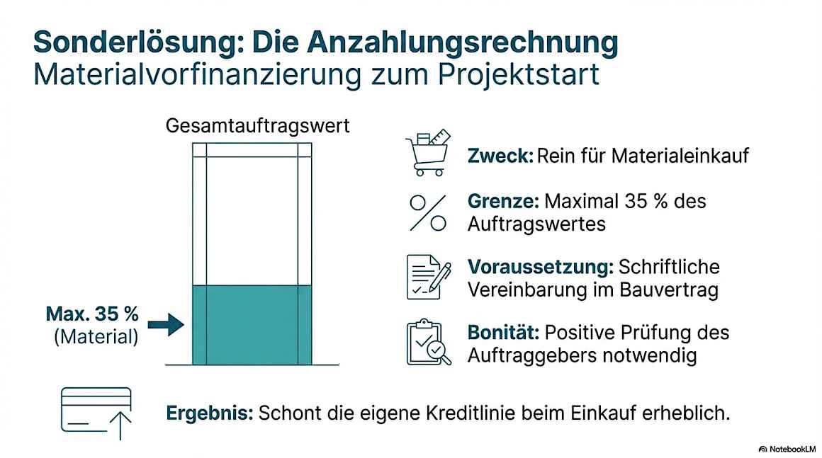 Grenzen: Nur 90 % sofort – 10 % Einbehalt folgt zeitverzögert · Abnahme und Aufmaß müssen lückenlos dokumentiert sein · Abtretungsverbote in GU-Verträgen vorab prüfen · Nicht alle Anbieter kaufen Abschlagsrechnungen an.