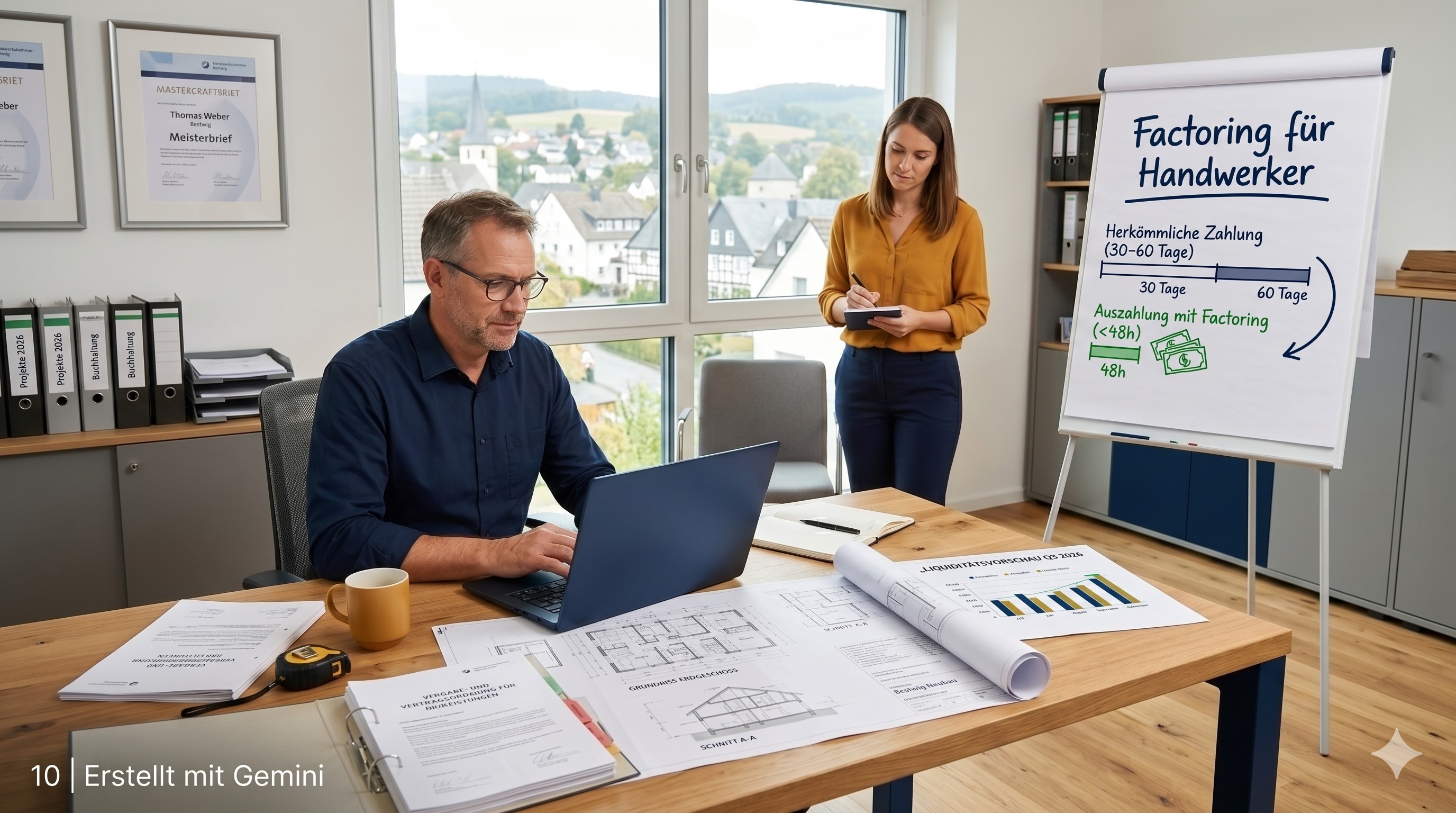 Die VOB-Struktur verschärft das Problem: Abschlagsrechnungen dürfen nur in Höhe des nachgewiesenen Leistungsstands gestellt werden. Der Factor kauft diese Abschlagsrechnungen sofort nach Leistungsnachweis an – was vorher 45 Tage dauerte, ist in 48 Stunden auf dem Konto.