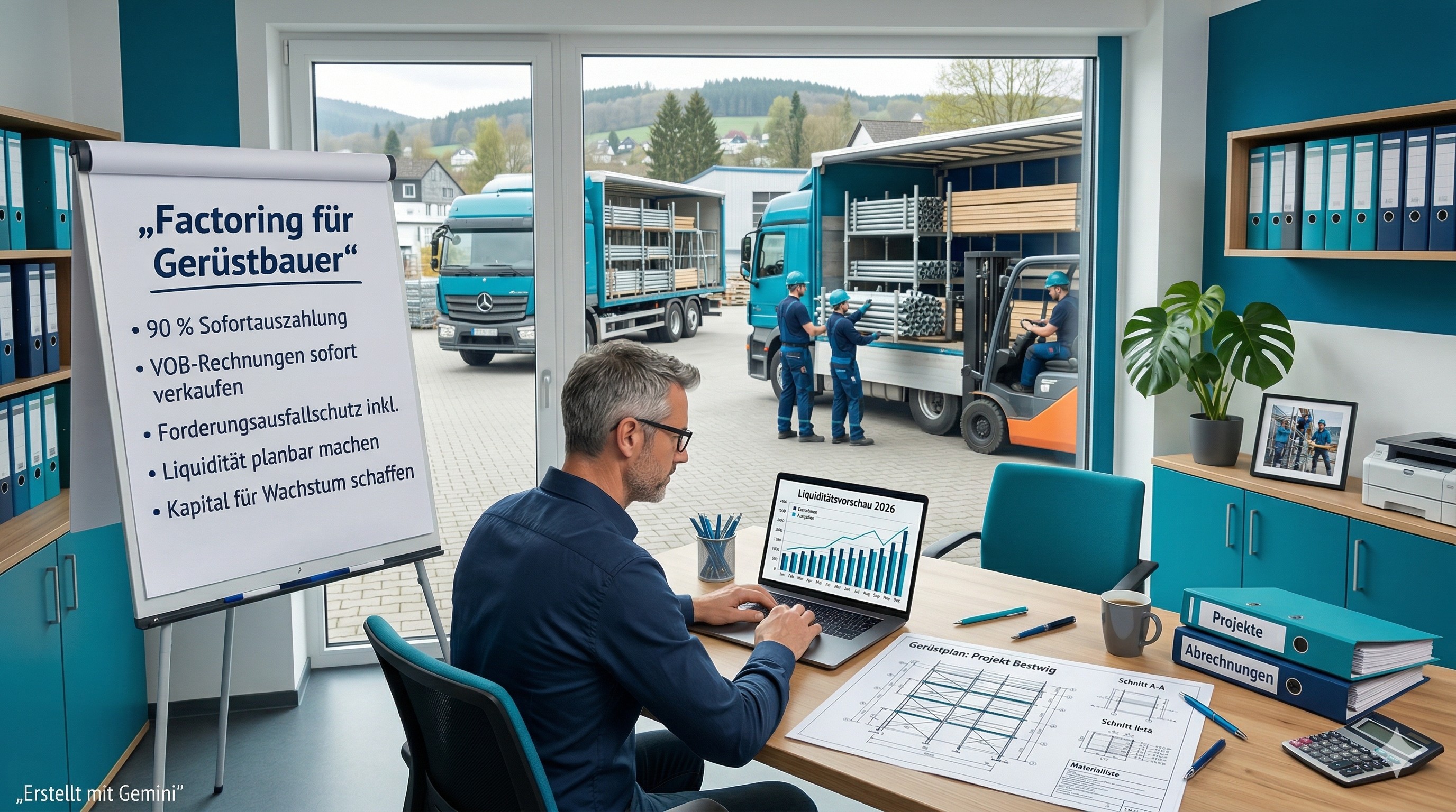 Gerüstbauunternehmen leisten kostspielige Vorarbeit – Gerüstmaterial, Montagekolonnen, Transportfahrzeuge – und warten nach Abnahme häufig 60 Tage auf den Zahlungseingang. Factoring schließt diese Lücke dauerhaft.