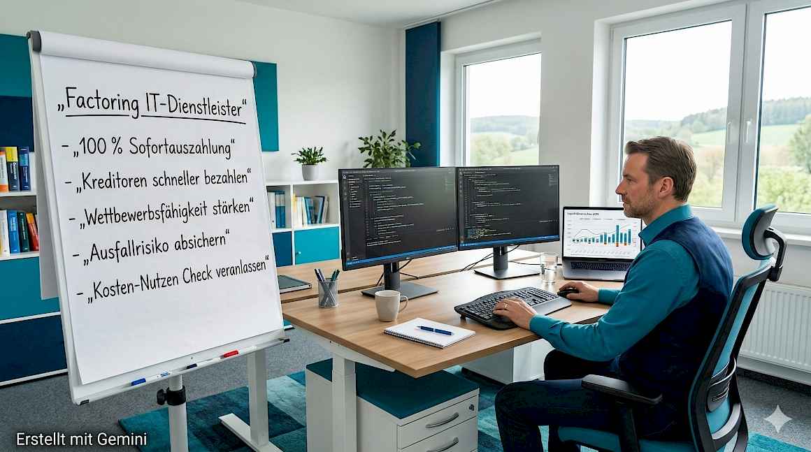 Beim echten Factoring schützt der Factor gegen Forderungsausfall. Für IT-Unternehmen, die mit wenigen, aber volumenstarken Unternehmenskunden arbeiten, ist das eine relevante Risikoabsicherung. Hinzu kommt der Bilanzeffekt: Forderungsbestand sinkt, Eigenkapitalquote steigt, Bankrating verbessert sich. Ein unabhängiger Vergleich spezialisierter Factoringanbieter deckt regelmäßig Konditionalunterschiede von 30 bis 50 % auf – bei 2 Mio. € Umsatz schnell fünfstellige Einsparungen pro Jahr.