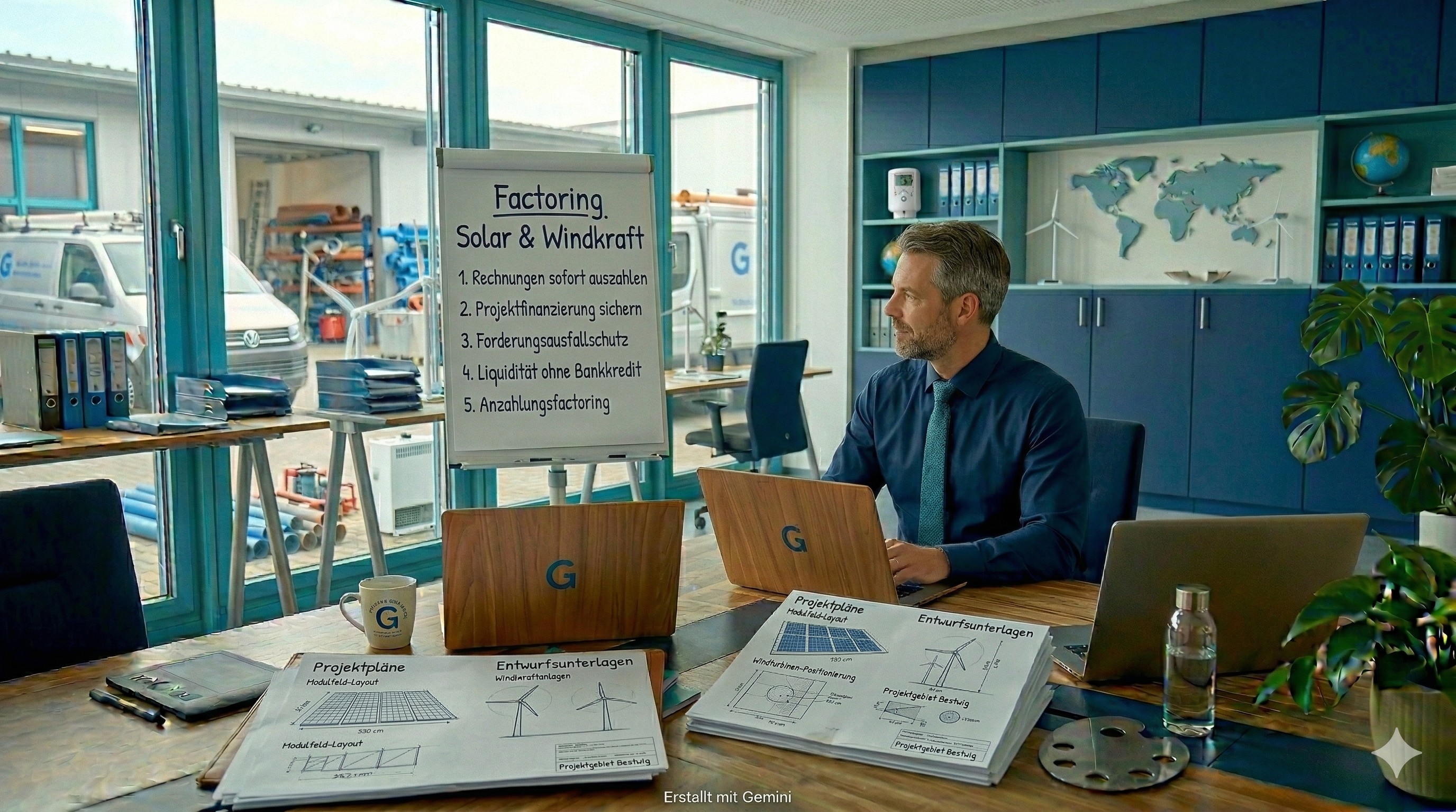Wer Solaranlagen installiert, Photovoltaikprojekte realisiert oder Windkraftanlagen errichtet, arbeitet kapitalintensiv auf Vorleistung. Die Rechnungsstellung erfolgt erst nach Abnahme – der Zahlungseingang oft Wochen später. Factoring schließt diese Lücke zuverlässig.