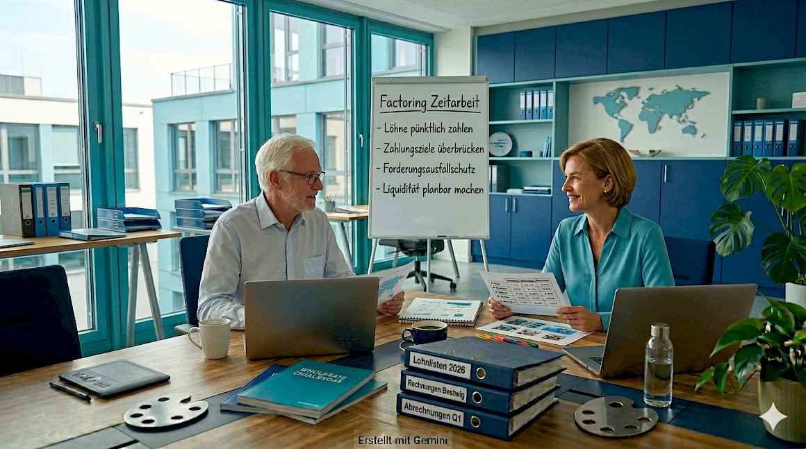 Wer nach Factoring für Zeitarbeit und Personaldienstleister oder Lohnvorfinanzierung sucht, beschreibt immer dasselbe strukturelle Problem: Der Personaldienstleister bezahlt seine Mitarbeiter sofort – der Auftraggeber bezahlt die Rechnung erst Wochen später. Je schneller das Unternehmen wächst, desto größer wird diese Lücke.
